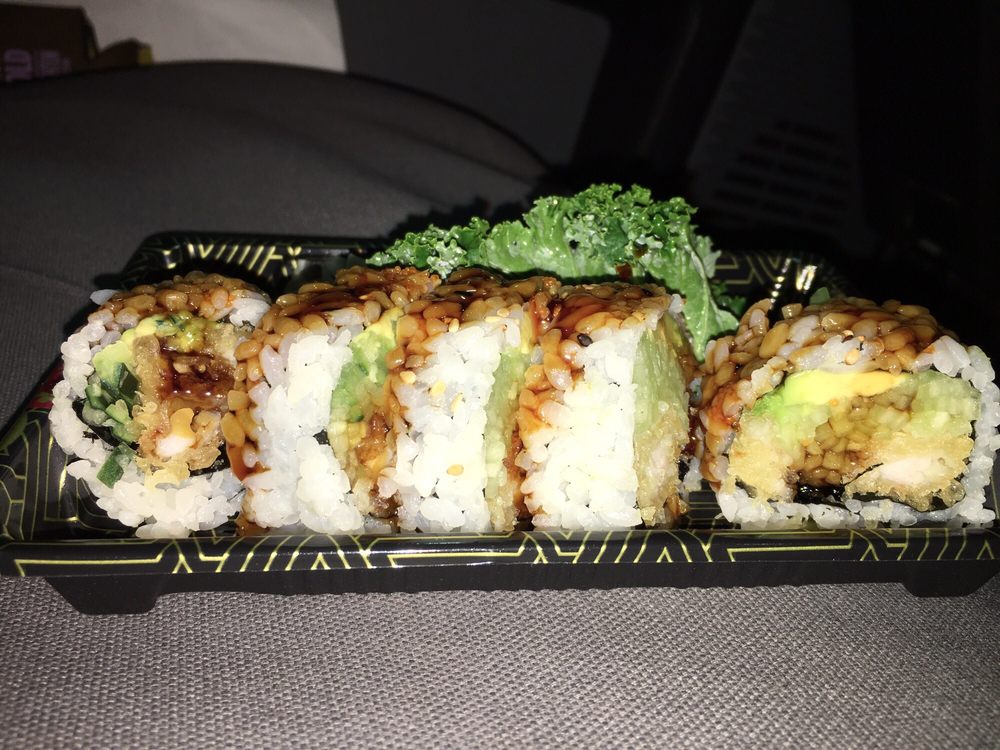 Shrimp tempura inside w. eel avocado eel sauce and sesame on top